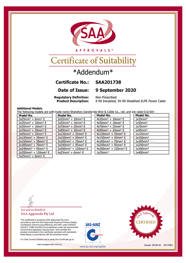 深圳建圳達(dá)電線電纜有限公司,成立于2000年,是一家電線電纜制造商,我們通過了世界各地不同市場(chǎng)的多數(shù)認(rèn)證,如:CCC、RoHS、CB、SAA、TUV、VDE、PSE、BPS、UL、CSA。我們根據(jù)定制產(chǎn)品不斷更新新的認(rèn)證。經(jīng)過數(shù)十年的發(fā)展,我們與來自世界各地的客戶建立了長(zhǎng)期的合作關(guān)系。我們?cè)?jīng)是菲律賓機(jī)場(chǎng),,柬埔寨的電力站,美國的醫(yī)院,工廠,埃塞俄比亞的水電站項(xiàng)目。我們是一家值得信賴的電線供應(yīng)商。